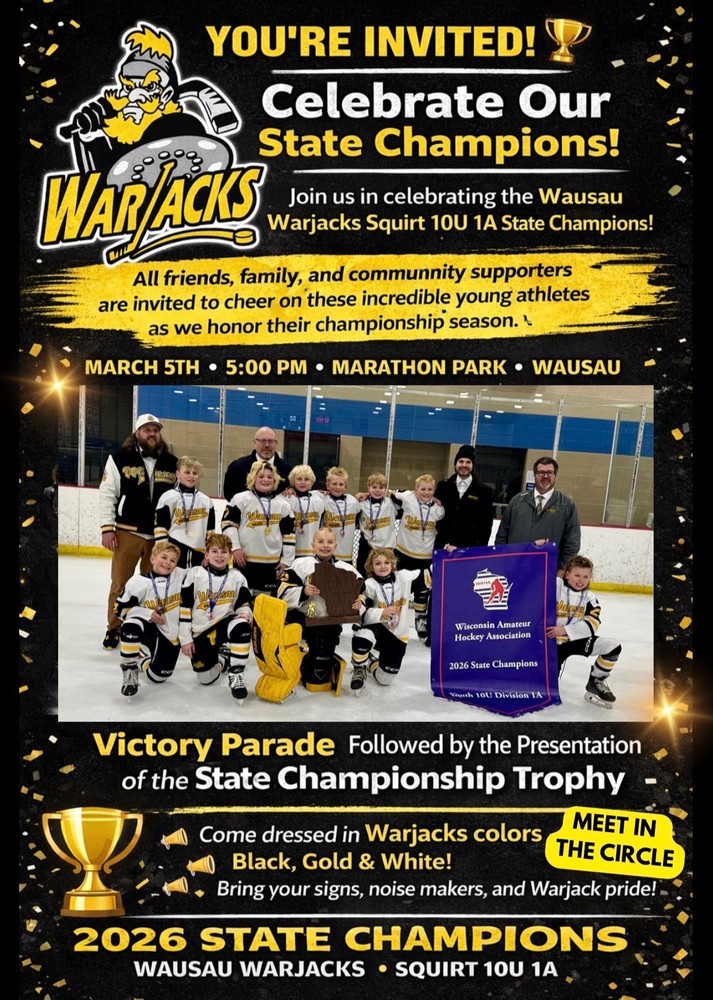 Come and bring your Warjacks pride to celebrate Squirt A bringing home the State Championship! Signs, noise makers, Warjacks apparel and colors are a welcome way to show your team spirit. Meet in the circle and stay for the trophy presentation.